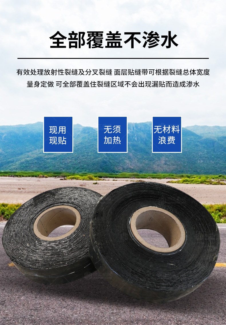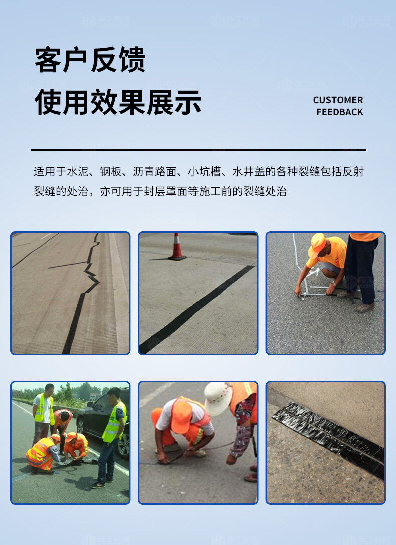 適用于水泥、鋼板、瀝青路面、小坑槽、水井蓋的各種裂縫包括反射裂縫的處治,亦可用于封層罩面等施工前的裂縫處治。可以阻止裂縫松散、滲水、崩邊、崩縫、坑槽。