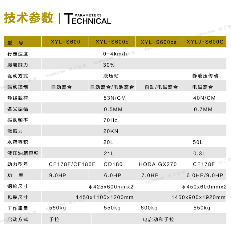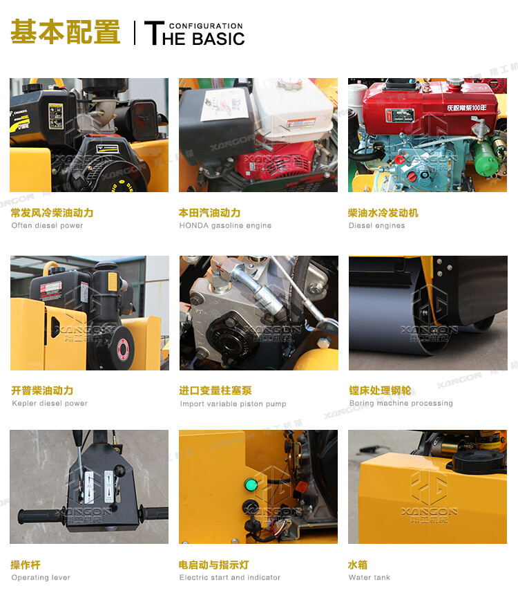 ·柴油動(dòng)力采用電啟動(dòng),輕便靈活換向機(jī)構(gòu);雙驅(qū)雙振,保證了整體的壓實(shí)和爬坡能力;
