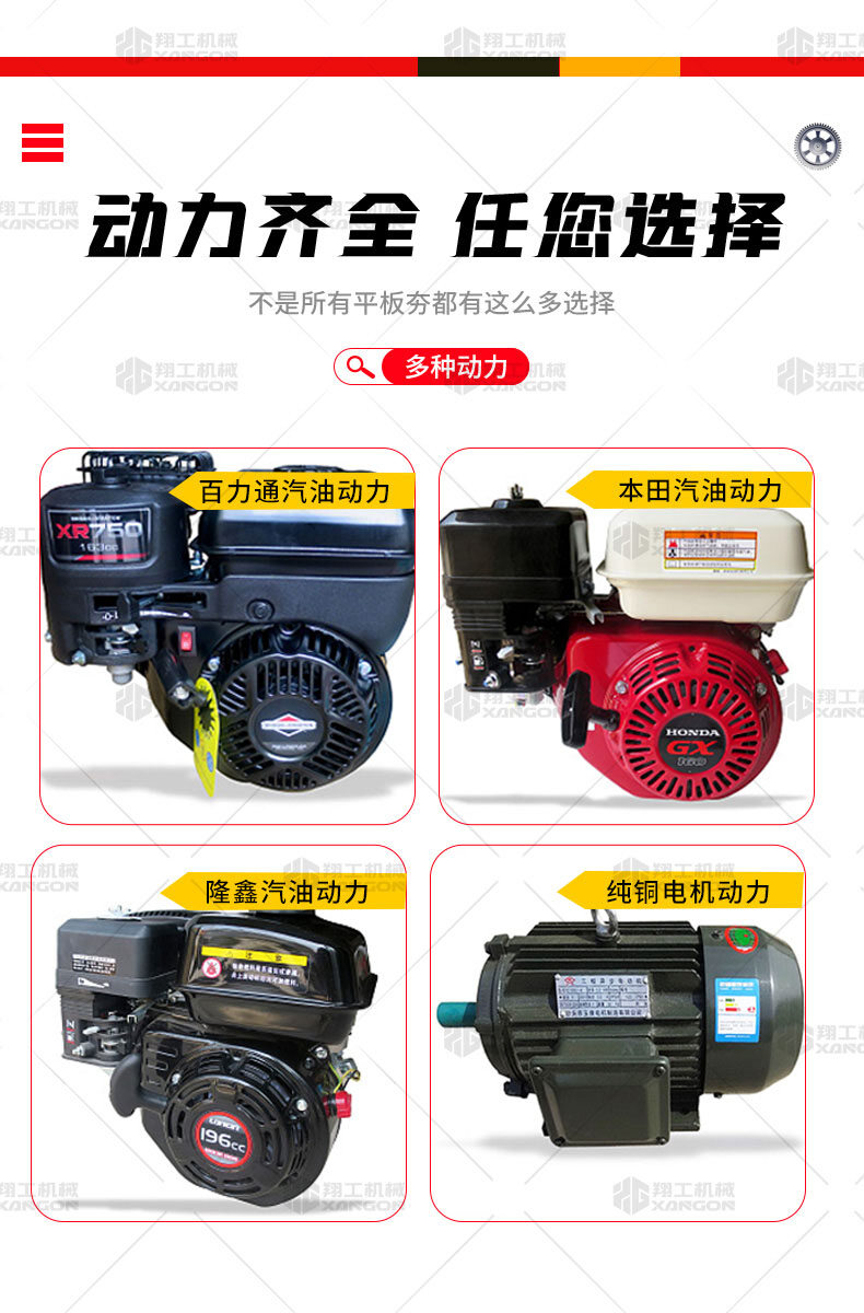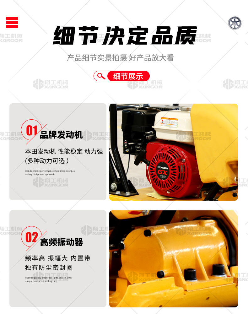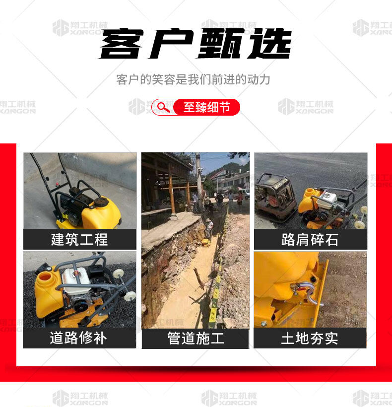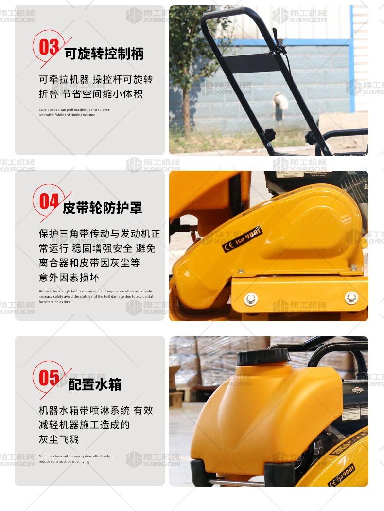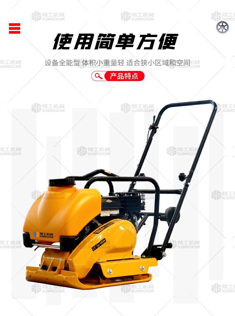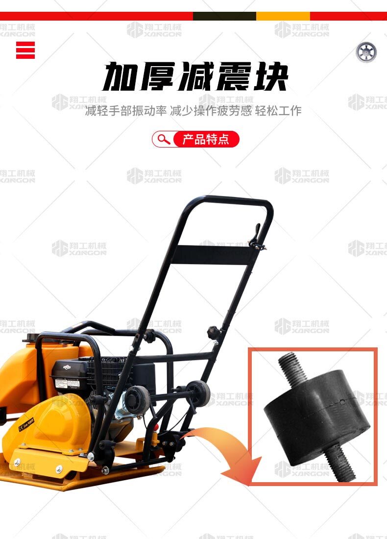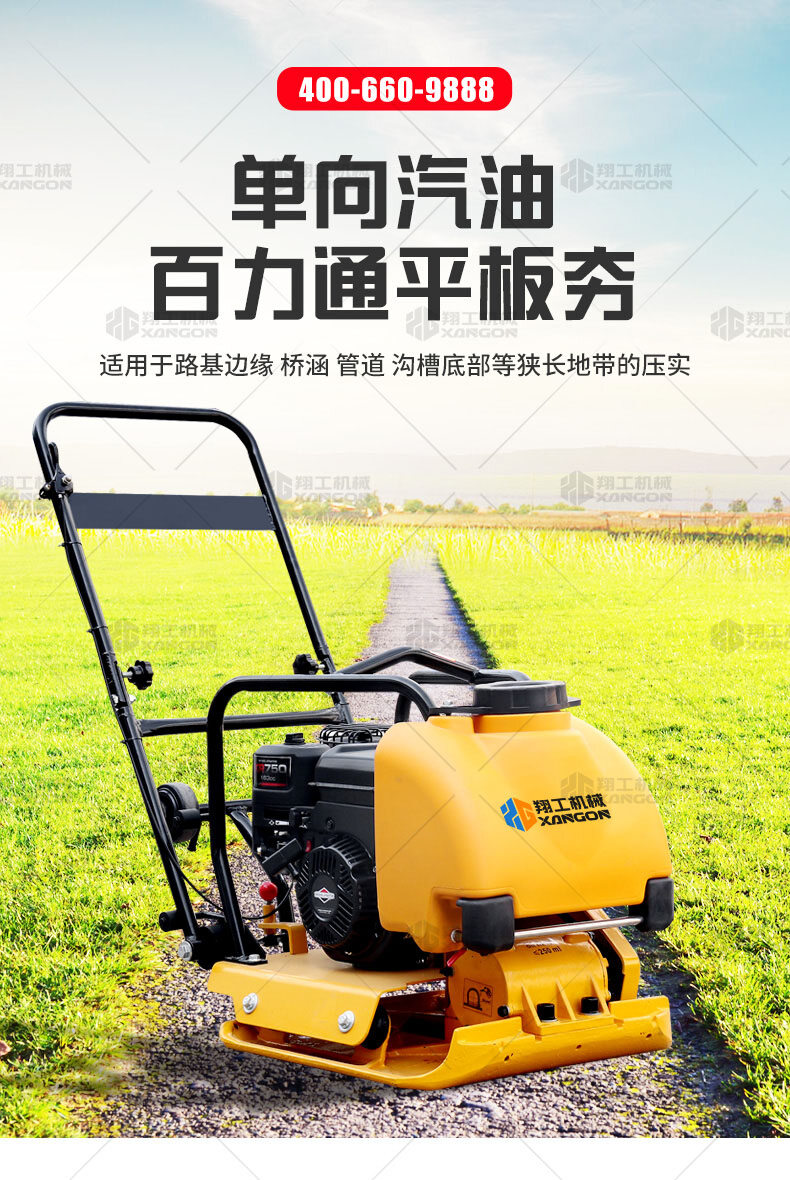 單向平板夯XPB-20適用于路基邊緣、橋涵、管道、溝槽底部等狹長(zhǎng)地帶的壓實(shí)。 HONDA動(dòng)力,性能優(yōu)越,啟動(dòng)容易 采用單獨(dú)懸掛式強(qiáng)力減震機(jī)構(gòu),減少對(duì)發(fā)動(dòng)機(jī)的沖擊,提高操作人員的舒服感;