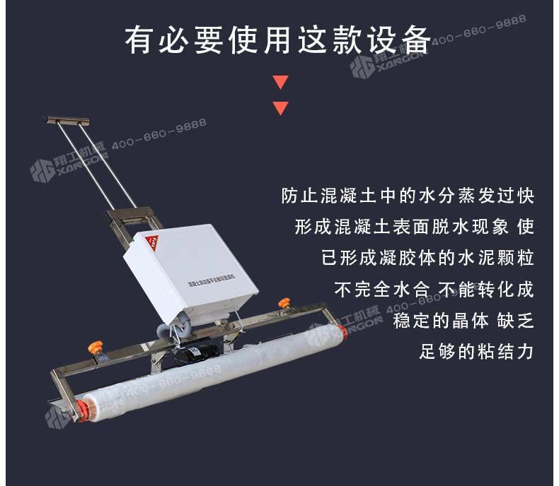 混凝土澆注后,如果養(yǎng)護(hù)不及時(shí)就容易產(chǎn)生一些不良效果,如氣候炎熱、空氣干燥等情況,我們就有必要使用這款設(shè)備,防止混凝土中的水分蒸發(fā)過快,形成混凝土表面脫水現(xiàn)象,使已形成凝膠體的水泥顆粒不完全水合,不能轉(zhuǎn)化成穩(wěn)定的晶體,缺乏足夠的粘結(jié)力。因此,混凝土表面會(huì)出現(xiàn)剝落或粉粒脫落。另外,當(dāng)混凝土強(qiáng)度不夠時(shí),過早蒸發(fā)水分會(huì)產(chǎn)生較大的收縮變形和干縮裂縫。因此,混凝土澆筑后的初期養(yǎng)護(hù)非常重要,終凝后應(yīng)立即進(jìn)行養(yǎng)護(hù)。