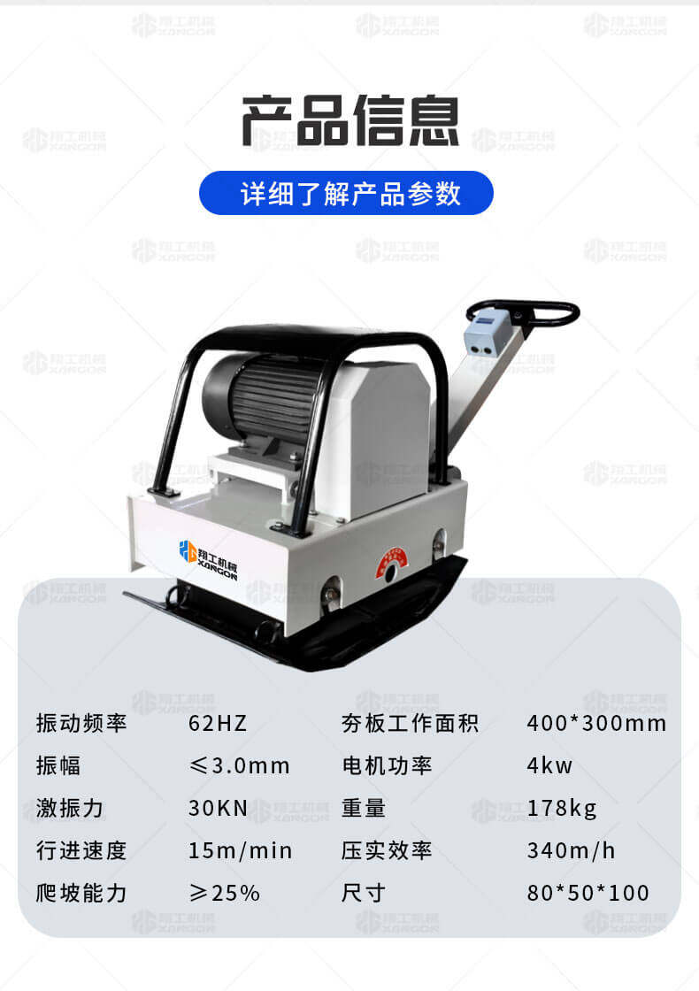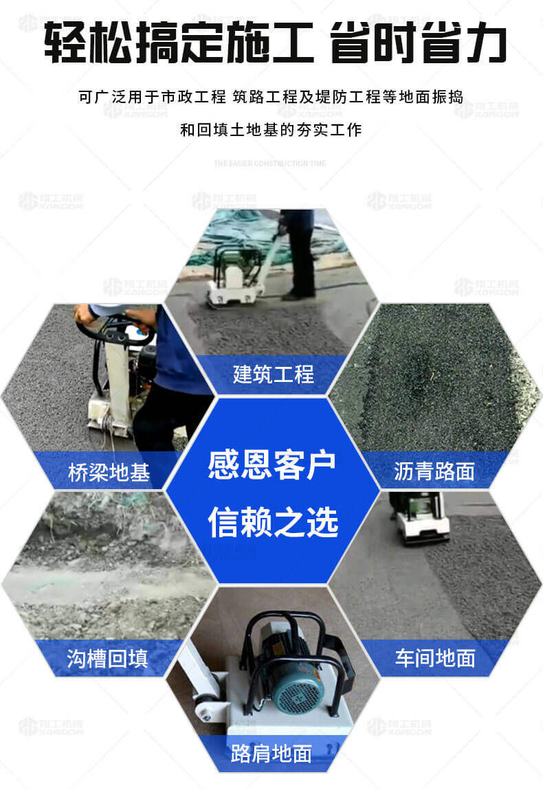 可廣泛的使用于建筑工程,預制構件廠,筑路工程及堤防工程等混凝土表面振搗和回填土,地基的夯實工作。