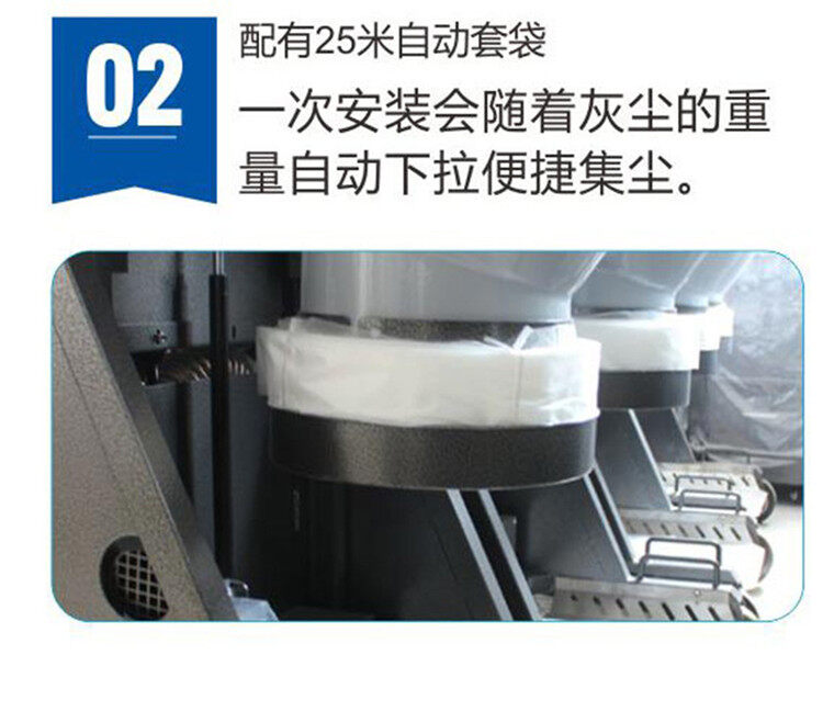 2.配有25米自動套袋,一次安裝會隨著灰塵的重量自動下拉,非常便捷,而且節(jié)省清潔時間。