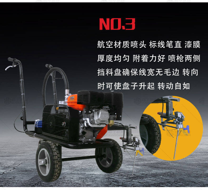 冷噴劃線機用汽油機帶動高壓泵的無氣噴涂技術運用于運動場地劃線車,噴出的線型清晰、流暢、飽滿、均勻、工作效率高。