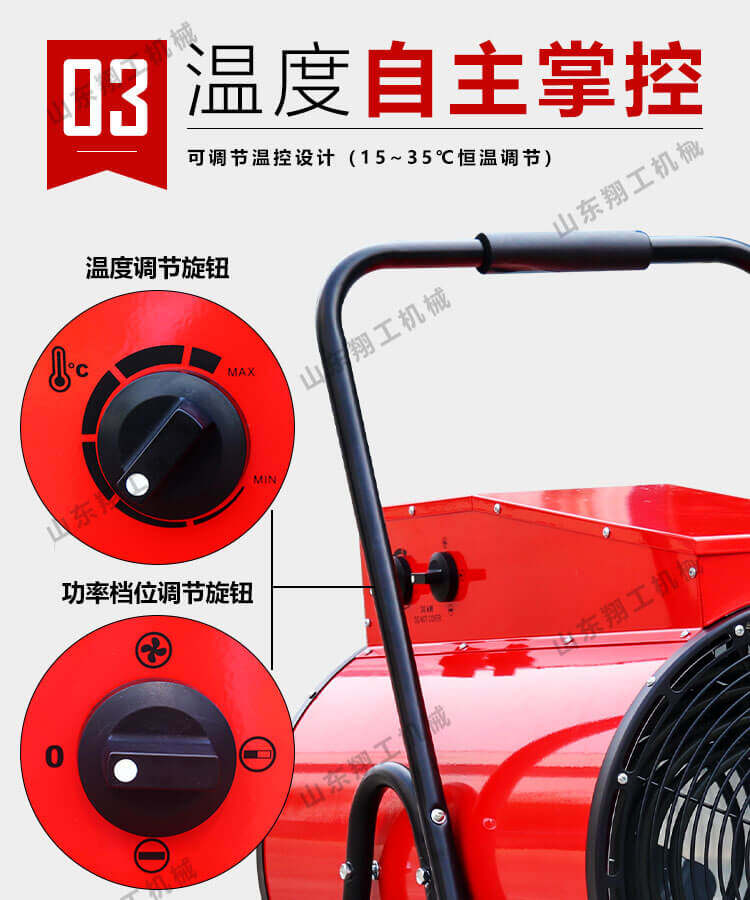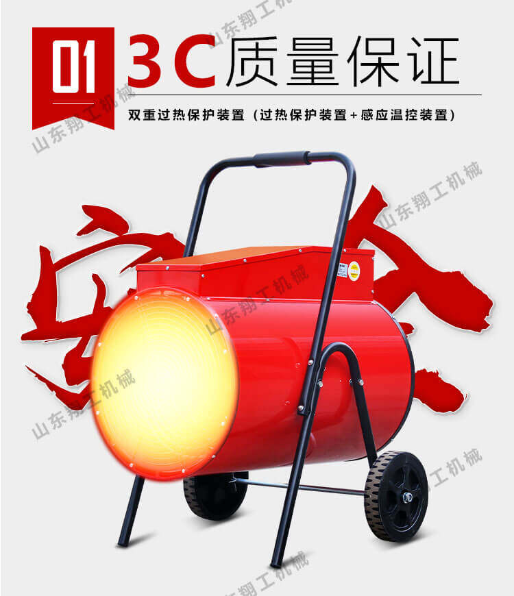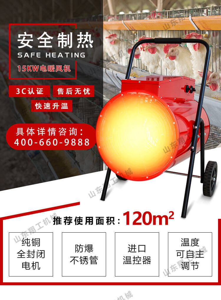 15KW電暖風(fēng)機優(yōu)點: 1、純銅全封閉電機 2、防爆不銹管(不銹管發(fā)熱元件作熱源保證產(chǎn)品的可靠) 3、取暖溫度可自動調(diào)節(jié)(調(diào)節(jié)功率) 4、進(jìn)口溫控器 5、外殼絕緣,防水