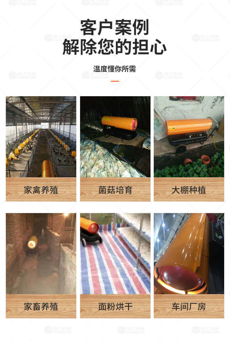 廠房、車間、養(yǎng)殖、建筑工地、辦公室、宿舍等局部取暖設(shè)施。 ☆任何需要加溫的場(chǎng)所。