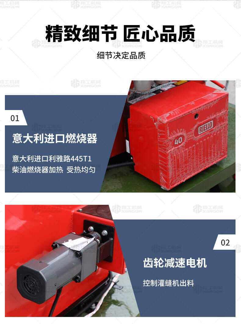 主要用于瀝青或水泥路面裂縫瀝青灌縫。汽油灌縫機(jī)主要有手推式和自行式手持灌縫管操作,采用進(jìn)口柴油燃燒器加熱。在工作時(shí)首先在料箱內(nèi)加入瀝青或灌縫膠,啟動(dòng)發(fā)電機(jī)供電,依次間斷打開導(dǎo)熱油泵開關(guān),燃燒器開關(guān),出料管加熱開關(guān);調(diào)整自動(dòng)溫控系統(tǒng)與材料的溫度相同,通過柴油燃燒器自動(dòng)加熱熔料箱內(nèi)導(dǎo)熱油開始升溫(拖式為強(qiáng)制循環(huán))使材料融化,溫度是通過自控系統(tǒng)來控制。溶料時(shí)間大約30-40分鐘左右。在材料融化、出料管溫度達(dá)到后可以進(jìn)行工作。手持灌縫管對(duì)正裂縫灌縫處理。瀝青泵的出料流量可調(diào)。在工作過程中隨時(shí)添加材料保證工作的連續(xù)性。