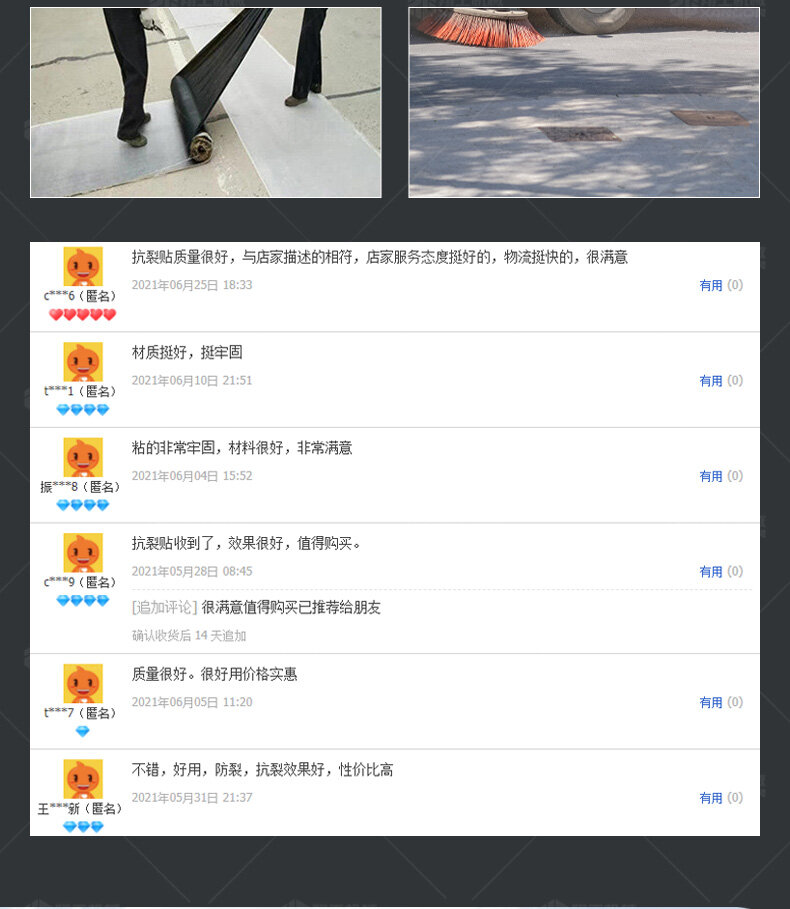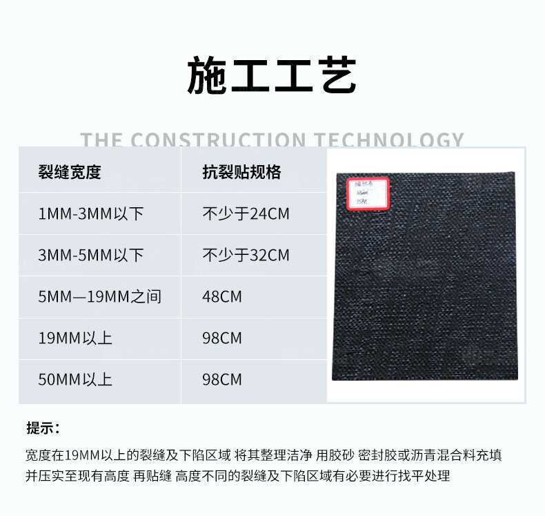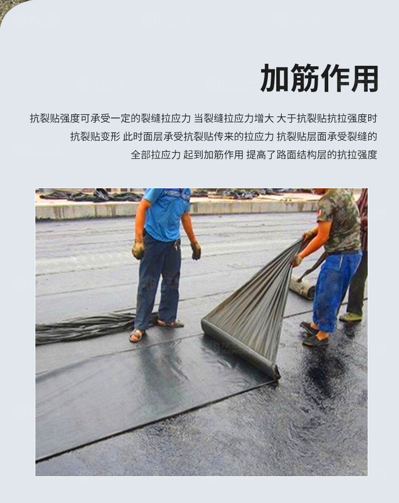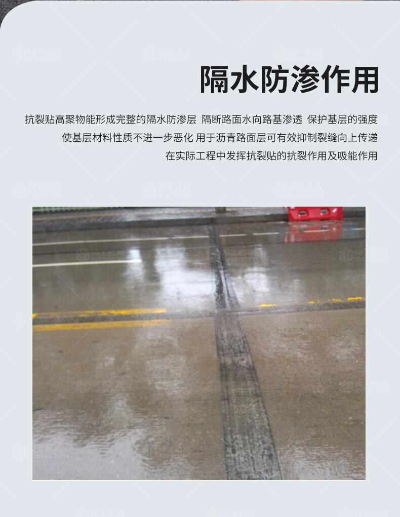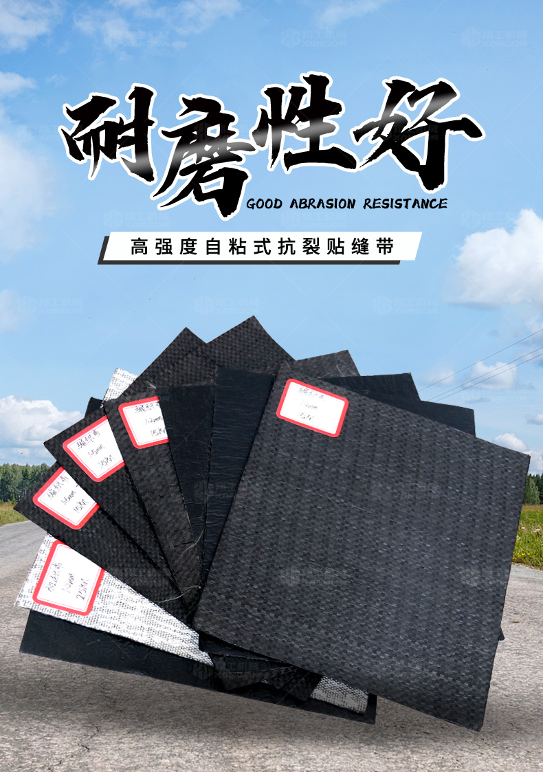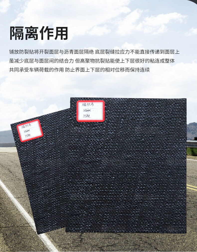 防裂貼(又稱抗裂貼)是由瀝青基的高分子聚合物、抗拉胎基、耐高溫并與瀝青相容的織物復(fù)合而成。將其貼于產(chǎn)生裂縫或剝落的瀝青混泥土面,能減少并阻隔其作用于路面的溫縮應(yīng)力,因此也減少了裂縫反射穿過面層的趨勢,鋪設(shè)與路面因其將基層與上部磨耗層隔離開來,從而使上面層免受多向位移及剪切應(yīng)力的影響,用于公路、橋梁、機(jī)場等。