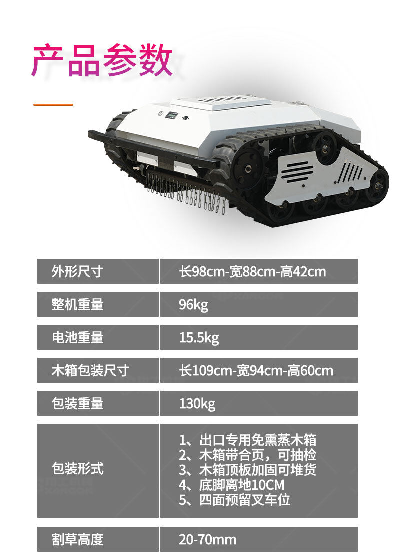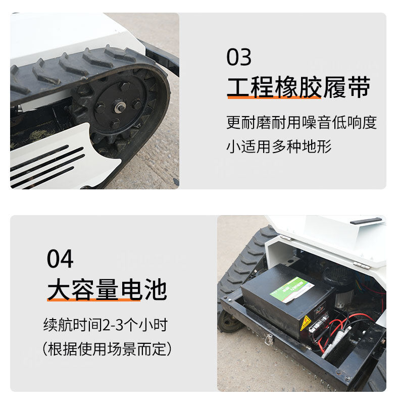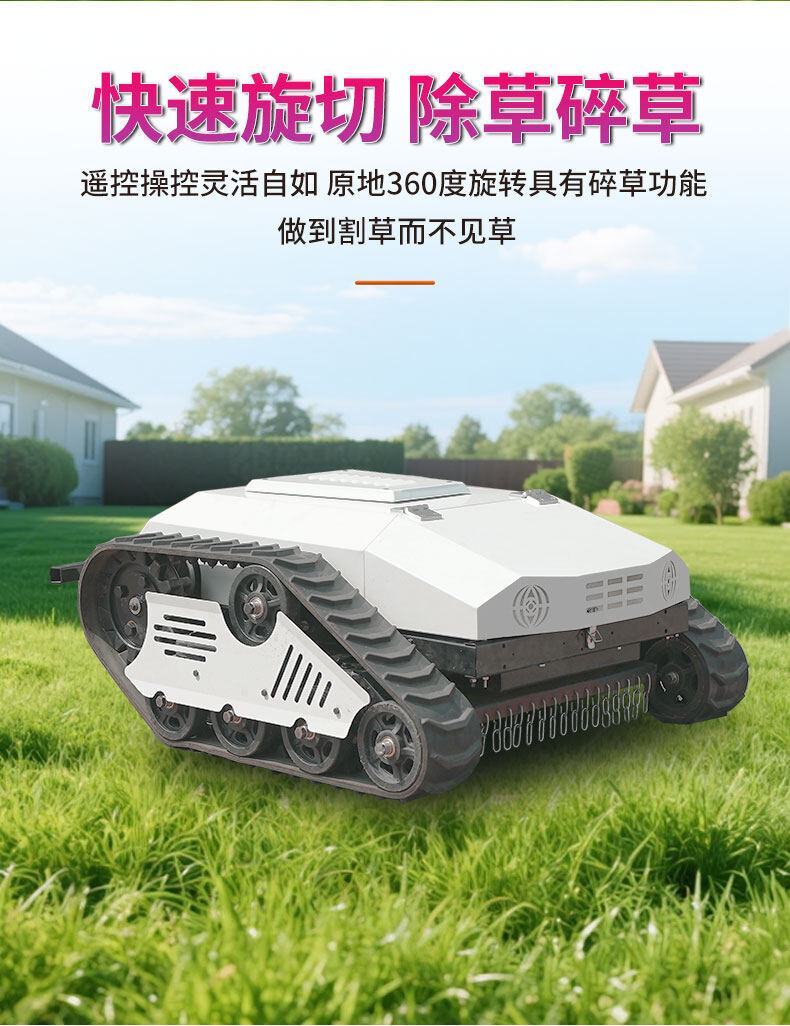 智能遙控履帶割草機(jī)采用鋰電池驅(qū)動(dòng),節(jié)能環(huán)保,續(xù)航持久;履帶式底盤設(shè)計(jì),輕松應(yīng)對(duì)復(fù)雜地形,爬坡越障能力強(qiáng)。配備智能遙控系統(tǒng),操作簡(jiǎn)單便捷,可遠(yuǎn)距離精準(zhǔn)控制。高效割草,低噪運(yùn)行,適用于庭院、公園及專業(yè)草坪養(yǎng)護(hù),是現(xiàn)代化園林管理的理想助手。